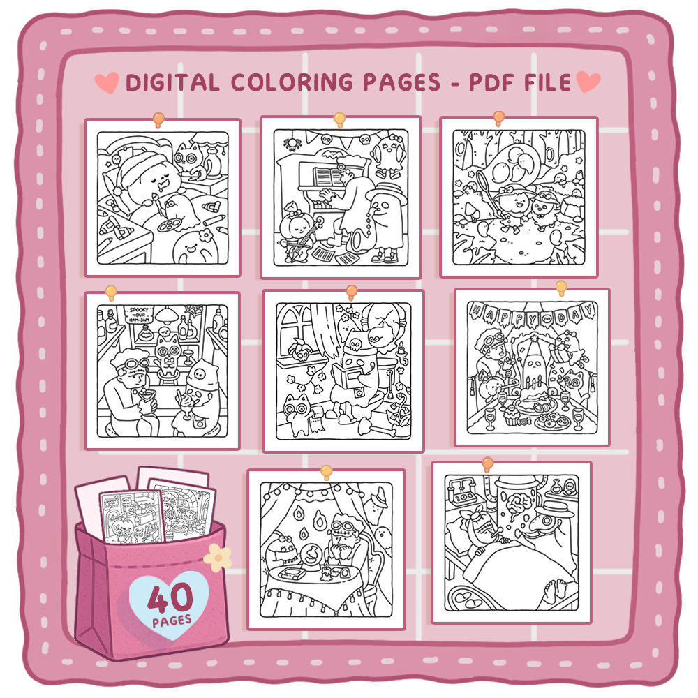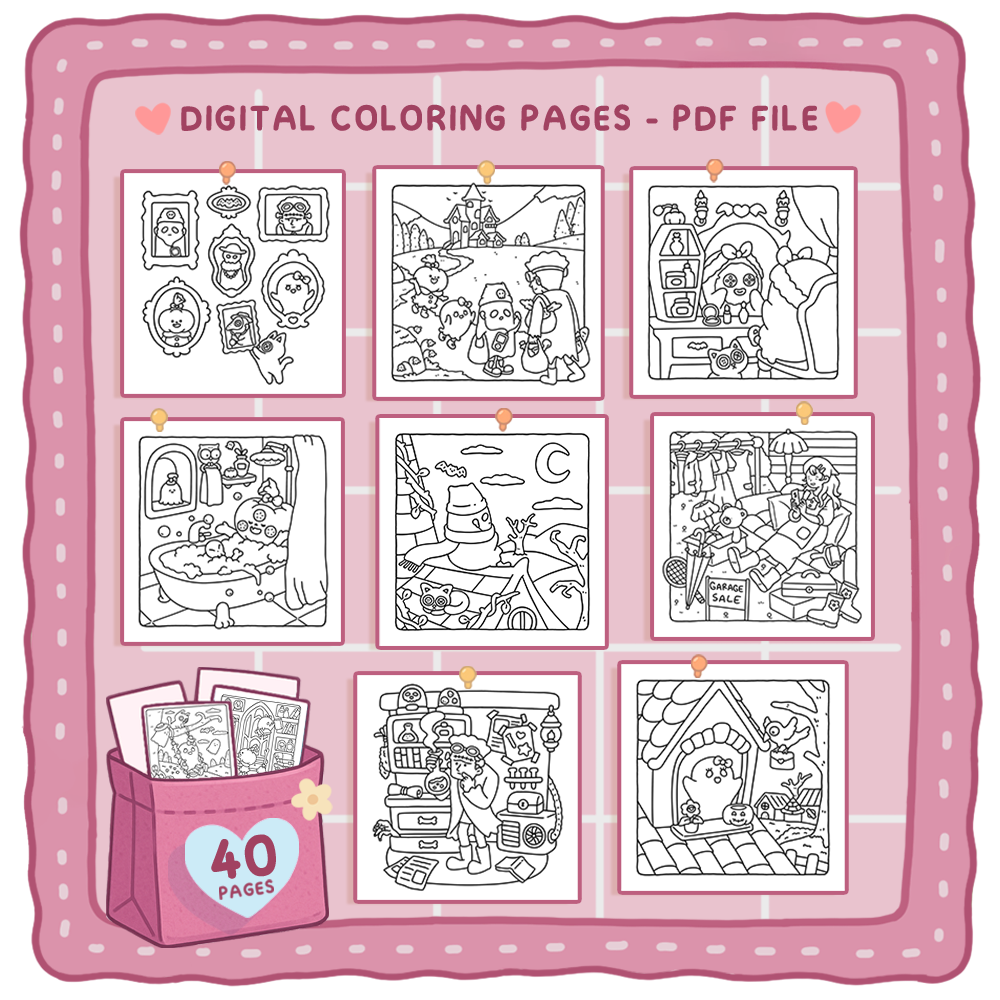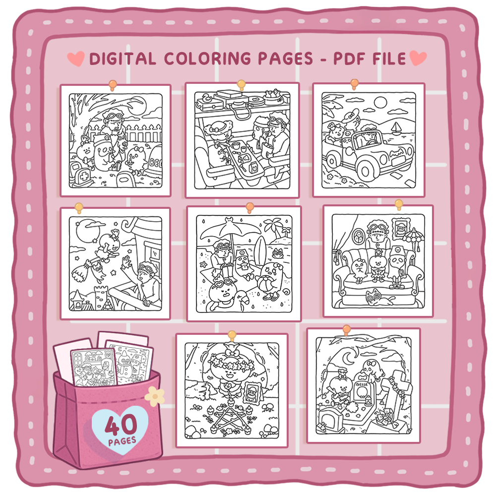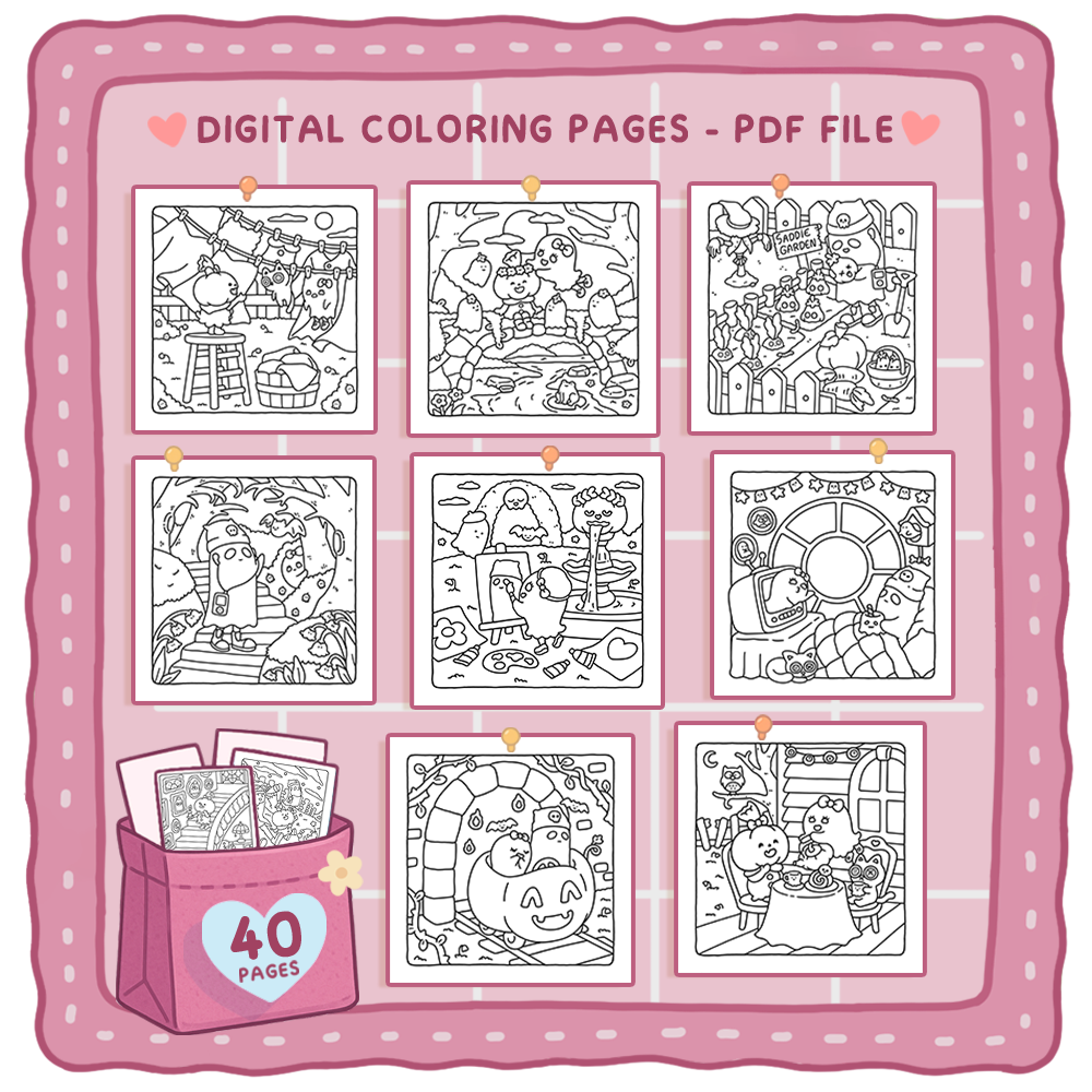 - One high-quality PDF file that includes 40 cute coloring pages.